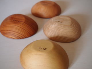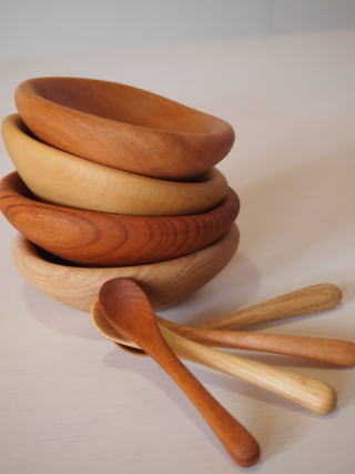 ケヤキ、ヒバ、セン、サクラの4種類の樹木で器とスプーンを製作